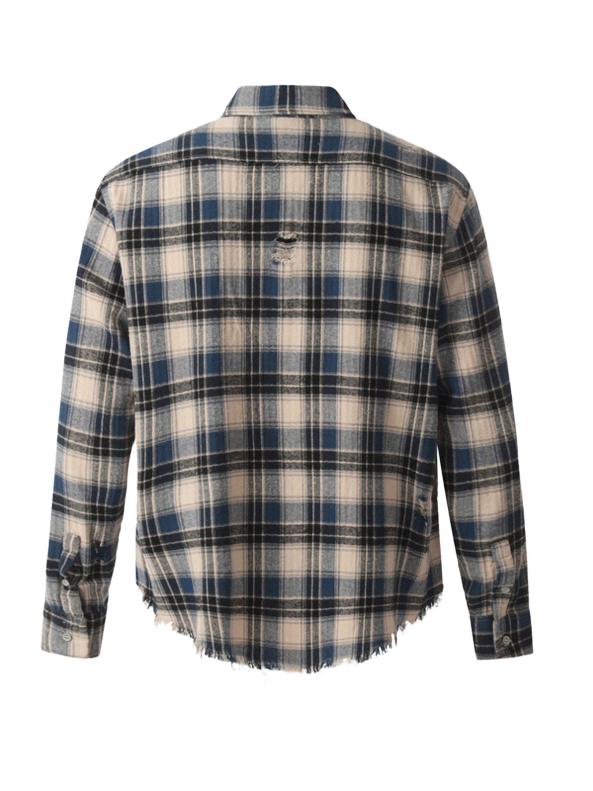 With raw edges, strategic rips, and a washed plaid pattern, this piece balances softness and edge. Style it open over a tank or fully buttoned for a polished, undone mood.