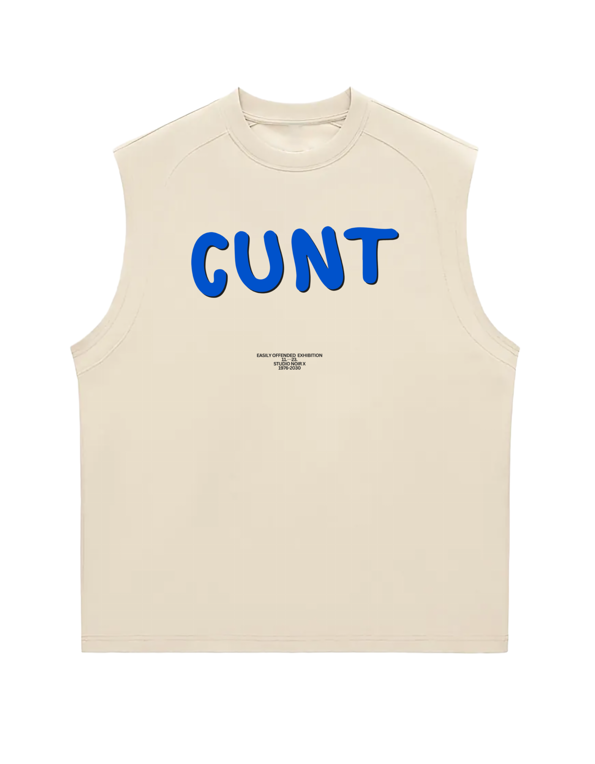 • Beige base with bold blue text graphic
